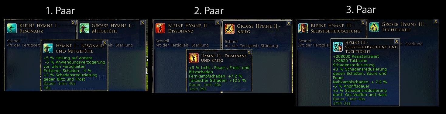 Ausnahme: Hymne der freien Völker, da diese kein Teil eines Paares ist. - Jede der Hymnen hat einen für den Barden persönlichen Buff