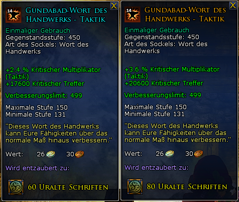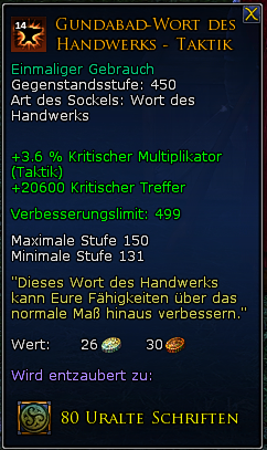 Die herstellbaren "Wort des Handwerks"-Muster sind zwar einmalig (d.h. du kannst in deinen beiden ausgerüsteten legendären Gegenständen