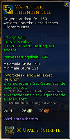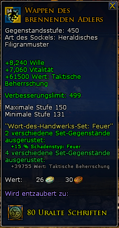 Willst du den 4-er Bonus erhalten, musst du 2 Mal das gleiche Wappen und 2 Mal das dazu passende "Wort des Handwerks" ausrüsten (ODER: Du kannst auch 4 Mal das gleiche "Wort des Handwerks" für das Set nehmen!)